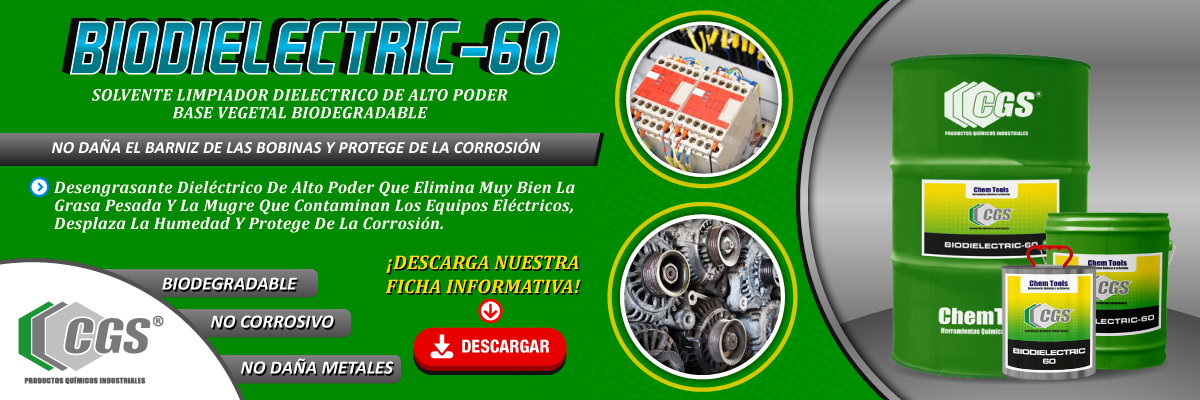 | Descripción Larga: | BIODIELECTRIC-60 es un desengrasante dieléctrico de alto poder que elimina muy bien la grasa pesada y la mugre que contaminan los equipos eléctricos, desplaza la humedad y protege de la corrosión. BIODIELECTRIC-60 es un solvente de alta rigidez dieléctrica, no evaporable que deja las bobinas selladas para evitar nuevamente la contaminación de los equipos; es recomendable en ambientes de mucha humedad (plantas de alimentos). BIODIELECTRIC-60 levanta el aislamiento de equipos eléctricos (bobinados) sin dañar el barniz de las bobinas y protege de la corrosión. BIODIELECTRIC-60 deja una película de protección que es totalmente dieléctrica, además no contiene hidrocarburos aromáticos ni compuestos clorados, es libre de butil, VOCs y ODCs. BIODIELECTRIC 60 posee un alto punto de inflamación, por lo que no es inflamable a temperatura ambiente o de trabajo, es 100% biodegradable por sus componentes de origen vegetal y no daña la piel. |