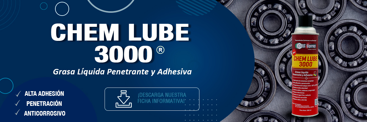 | Descripción Larga: | CHEM LUBE 3000 es una Grasa liquida Adhesiva color Azulado de alta penetración, Brinda una lubricación superior en rangos de temperatura desde -35 ºC a 200 ºC. Diseñado para partes móviles que soportan fuertes cargas y vibraciones. Se adhiere a las superficies verticales y penetra dentro de cables de acero y los mecanismos de cadenas de rodillos. Esta grasa líquida no gotea y penetra profundamente en componentes articulados, formando una película resistente al agua y de larga duración. CHEM LUBE 3000 Es un producto que provee una acción superior de adhesión proporcionando en las piezas de trabajo una capa altamente lubricante que resiste el lavado y la intemperie. No ataca metales y es seguro sobre la mayoría de plásticos. No contiene disolventes clorados. |