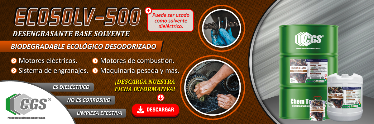 | Descripción Larga: | ECOSOLV-500 es una mezcla de destilados de petróleo y aceites esenciales naturales, exento de compuestos aromáticos y clorados, que le confiere la cualidad de ser un producto desodorizado, biodegradable y no tóxico; propiedades que le confieren un elevado grado de solvencia sobre las superficies sucias con grasas, aceites, ceras y otros. ECOSOLV-500 es un desengrasante base solvente, limpiador de piezas mecánicas, diseñado para ser usado exclusivamente con el equipo CHEM WASHER. Evita la oxidación de partes mecánicas por presencia de humedad por tener inhibidores de corrosión en su formulación balanceada. Tiene una evaporación moderada lo que le permite penetrar en partes inaccesibles de los equipos, asimismo, este producto se puede usar como un limpiador dieléctrico en la limpieza de motores eléctricos, tableros de control y sistemas electrónicos. |